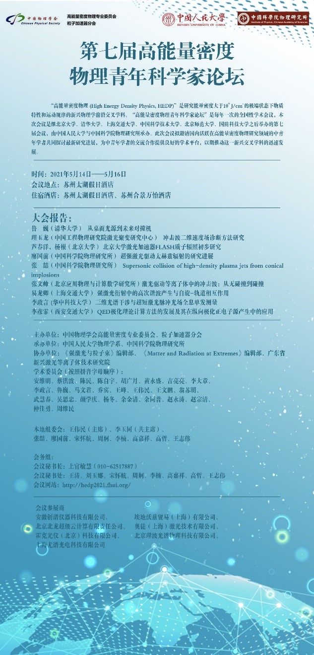2021年5月14日至2021年5月16日,由中国物理学会高能量密度物理专业委员会、粒子加速器分会主办,伟德国际VICTOR1946物理学系与中国科公司物理研究所承办的"第七届高能量密度物理青年科学家论坛"在江苏省苏州市成功举办。