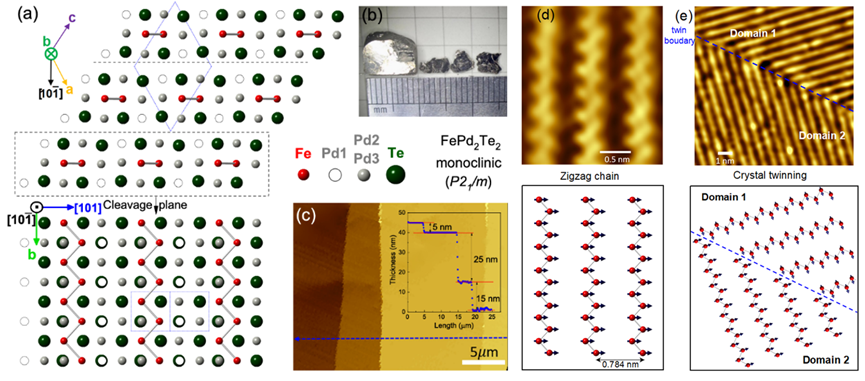 近日,伟德国际VICTOR1946物理学系程鹏副教授课题组发现一种具有全新晶体结构的新型磁性二维材料FePd2Te2,并与程志海教授课题组、中科院强磁场科学中心郑国林研究员团队和衢州公司杨建辉教授合作对其结构与物性进行深入研究,发现FePd2Te2是一个非常少见的具有面内单轴各向异性的二维铁磁金属,并在一种特殊孪晶结构作用下形成了有趣的面内自旋纹理结构。相关研究成果以“FePd2Te2: An Anisotropic Two-Dimensional Ferromagnet with...